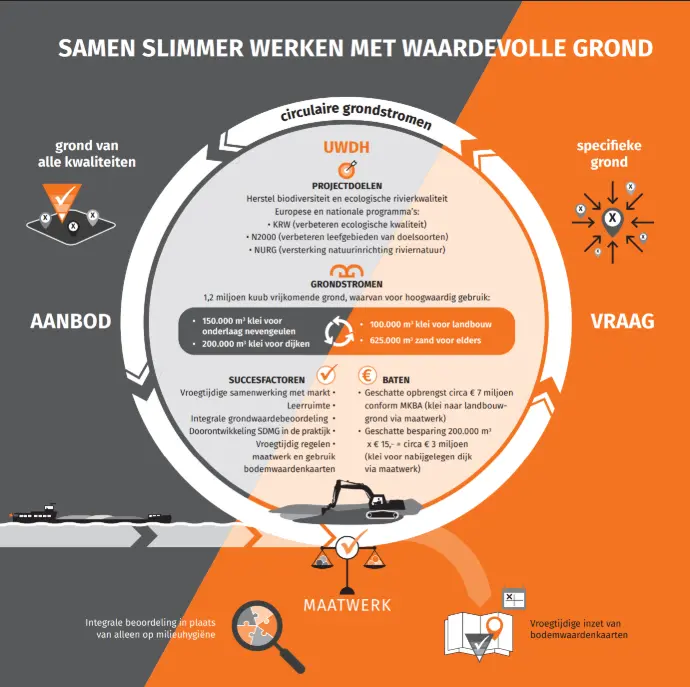 Het is van essentieel belang om de waarde van grond te behouden. Door klei uit het rivierengebied in te zetten op een locatie om daar de kwaliteit van de bodem te behouden of te verbeteren, vindt hoogwaardig gebruik van grond plaats. Een voorbeeld is de herinrichting van de uiterwaarden bij Wamel, Dreumel en Heerewaarden aan de Waal (UWDH), in samenwerking met het Europese project LIFE CO2SAND. Dit project stimuleert hoogwaardig gebruik van rivierklei als grondverbeteraar bij zandgronden in de landbouw.